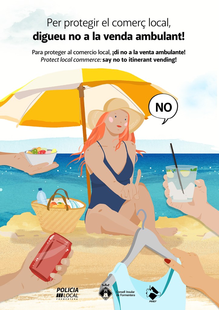 Petita campanya del Consell de Formentera i la Petita i Mitjana Empresa de Formentera contra la venda ambulant en platges. M’encanta quan em donen una campanya que ja funciona per donar-li un toc «més amable».