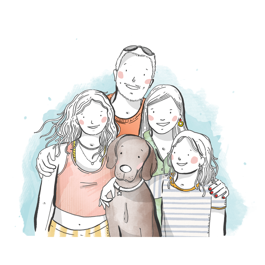 De vegades dibuixo famílies que no he vist mai. Em passen fotos i, mentre els copio, m’imagino com son. Aquesta família m’ha agradat molt fer-la, perquè a totes les fotos s’agafen entre ells i tenen les cares molt juntes. I això, a mi m’encanta.