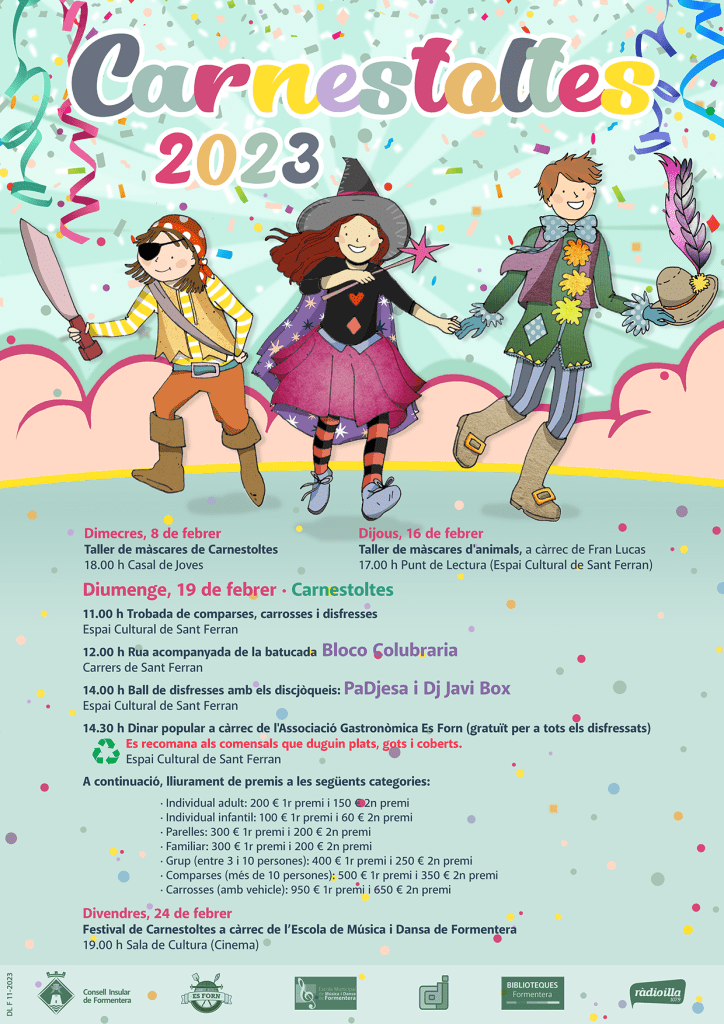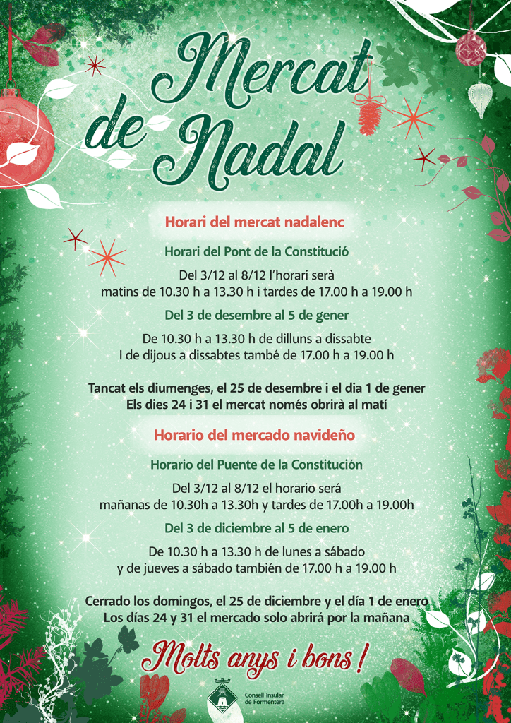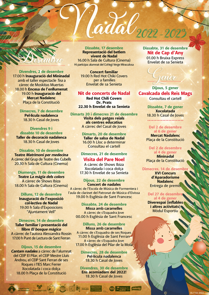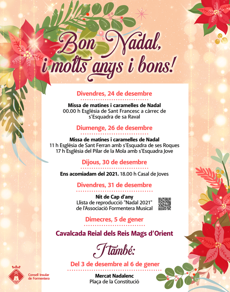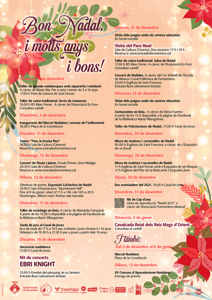 Per Nadal desenvolupem una cartelleria molt àmplia. Cada any dissenyem una línia gràfica pròpia amb elements nadalencs típics de Formentera (on no hi ha neu, ni avets, ni la majoria dels elements clàssics del Nadal) i a partir d’aquí surten els cartells individuals de cada acte, la felicitació del/la president/a, el cartell de la cavalcada i les imatges per als stories i els post de les xarxes.