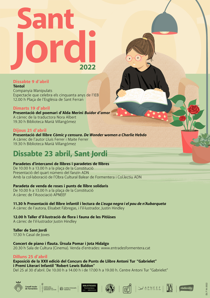 Una mostra d’alguns dels cartells que he fet per Sant Jordi. A partir d’aquí dissenyem la resta de material necessari (bosses, cartells individuals dels actes, diplomes, imatges per a xarxes…)